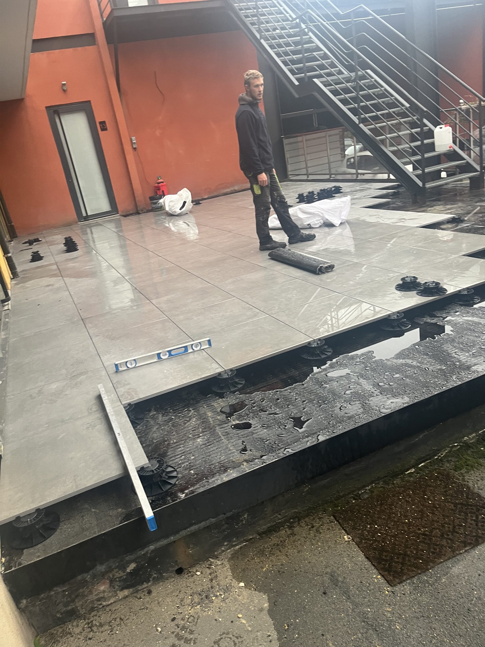 Infos clés : Démontage de l’ancienne étanchéité du parvis en enrobé. Pose d’un nouveau complexe bitumineux et d’une protection en dalle cramique